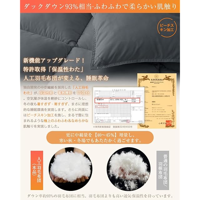 【ダックダウン93%相当・特許取得「人工羽毛」保温力UP】独自開発の中空繊維を採用した「人工羽毛わた」が、保温性能と蓄熱機能を強化しました。さらに中綿量を【40~45%】増量しているため、寒い秋・冬でも暖かく過ごせます。