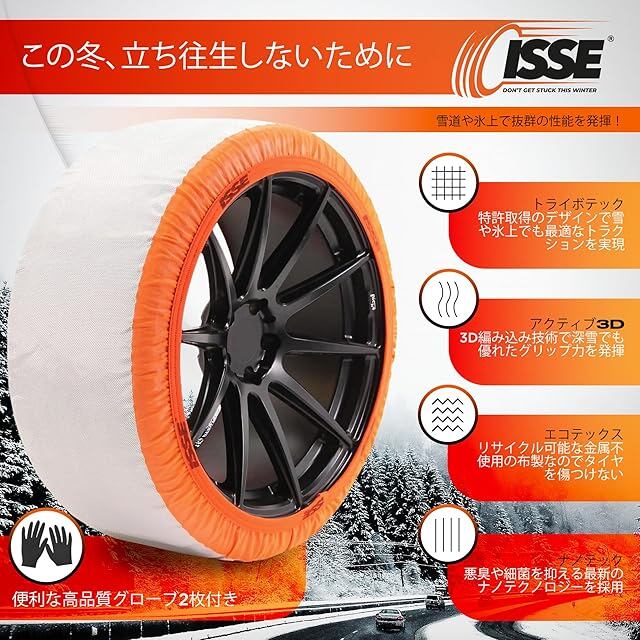 軽量で取り付けも簡単な布製タイヤチェーンはいざという時の緊急脱出ツールとして注目されています。<br><br> イッセ・スノーソックスは、軽量でコンパクト、取り付けやすいという布製ならではの特性はもとより、金属チェーンに匹敵する圧倒的なグリップ力をほこるヨーロッパ生まれの布製タイヤチェーンです。<br><br> 圧雪、深雪、アイスバーンの他、水分の多い日本の雪路、シャーベット状の路面、どんなコンディションでも安心して走行できます。<br><br> 生地は業界最強級の耐久性を誇り、繰り返し装着しても破れません。また独自のオートセンター機能がイッセ・スノーソックスを走行中も適正な位置に維持し、ずれません。<br><br> 6サイズで市販のほぼすべてのタイヤサイズをカバー。SUVや大型乗用車、クリアランスの狭いスポーツカータイプにも装着できます。年に数回の利用であれば洗って保管することで数年は使用可能なため、冬用タイヤに履き替えるための時間的・経済的なコストもありません。<br>