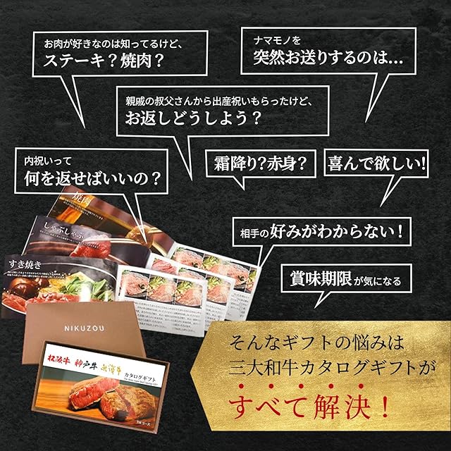 松阪牛・神戸牛・米沢牛から選べるカタログギフトです。