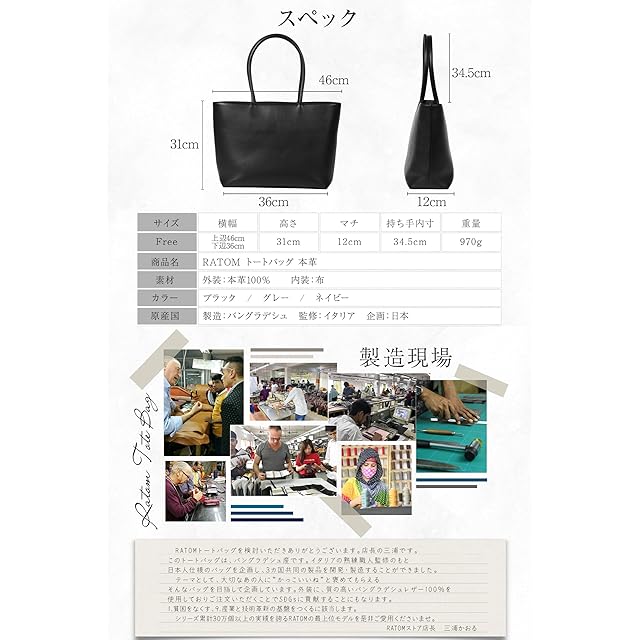 【仕様】3カ国共同開発(原産製造:バングラデシュ、検品監修:イタリア、仕様企画:日本) 本体サイズ:上辺46cm-下辺36cm*高さ31cm*マチ12cm 持ち手の高さ:24.5cm 重量:970g カラー:ブラック、グレー、ネイビー