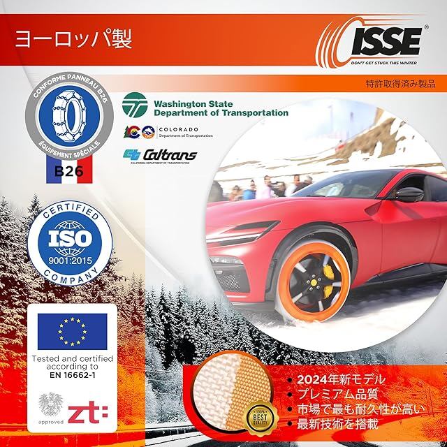軽量で取り付けも簡単な布製タイヤチェーンはいざという時の緊急脱出ツールとして注目されています。<br><br> イッセ・スノーソックスは、軽量でコンパクト、取り付けやすいという布製ならではの特性はもとより、金属チェーンに匹敵する圧倒的なグリップ力をほこるヨーロッパ生まれの布製タイヤチェーンです。<br><br> 圧雪、深雪、アイスバーンの他、水分の多い日本の雪路、シャーベット状の路面、どんなコンディションでも安心して走行できます。<br><br> 生地は業界最強級の耐久性を誇り、繰り返し装着しても破れません。また独自のオートセンター機能がイッセ・スノーソックスを走行中も適正な位置に維持し、ずれません。<br><br> 6サイズで市販のほぼすべてのタイヤサイズをカバー。SUVや大型乗用車、クリアランスの狭いスポーツカータイプにも装着できます。年に数回の利用であれば洗って保管することで数年は使用可能なため、冬用タイヤに履き替えるための時間的・経済的なコストもありません。<br>