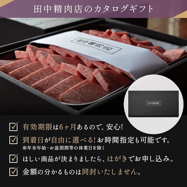 【お届けセット内容】 田中精肉店、商品ご案内用リーフ×1 ●引き換え用申し込みはがき×1 出し忘れ防止のために余裕をもった期日の設定をしております。欲しい商品が決まったら、ハガキで簡単申し込み。ご注文いただいた商品は365日いつでもお届け!時間帯の指定も可能です。お相手方のご都合を気にせずお贈りいただけます。金額の分かるものは一切同梱いたしません、ご安心ください。