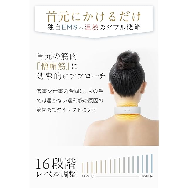 【首にフィットする着け心地】 2枚の電極パッドと柔軟性のあるフレーム設計で、首にピッタリフィットします。 お肌に優しい材質で、心地よい装着感です。