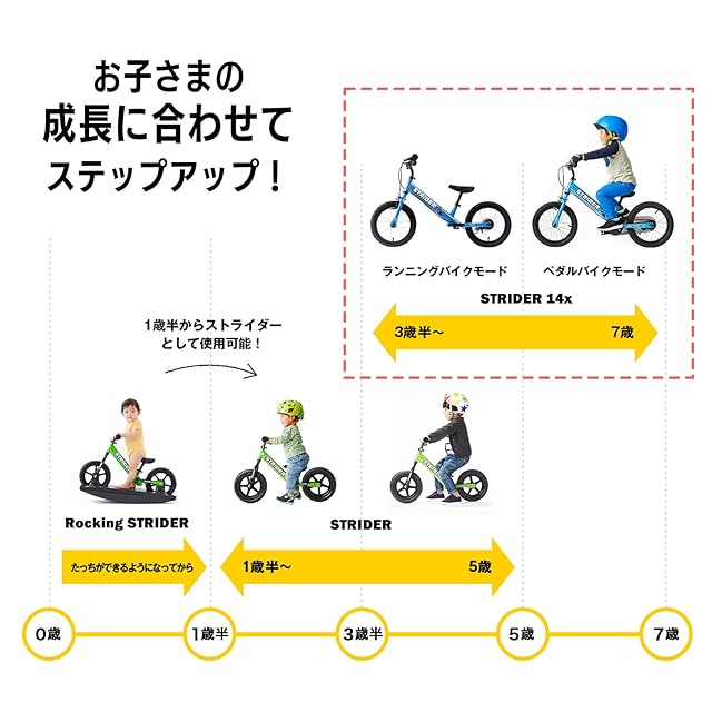 説明:14インチホイールと着脱式ペダルユニットを搭載したストライダー14xは軽量で取り回しがしやすく、お子さまのファーストペダルバイクに最適です。