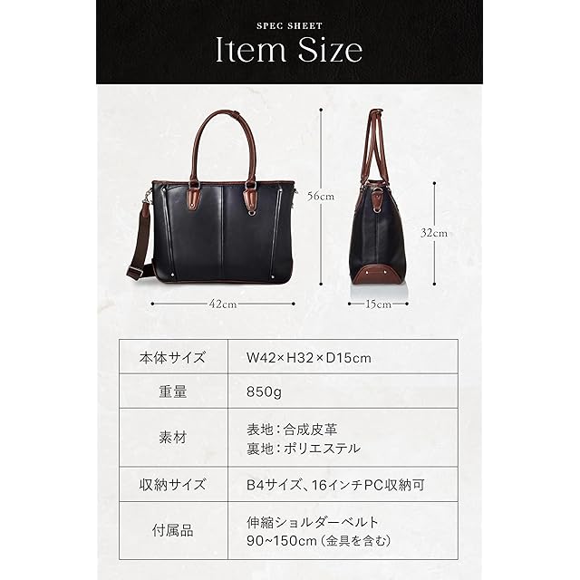 【洗練された機能美】便利な小物ケース付きで、失くしがちな小物をしっかりと整理し、すぐに取り出すことができる。ファスナー付きメインルームには大事なものを収納したい。ファスナーがついているので、雨がカバンの中にも入らないのもうれしい。ビジネスマンにとっては、必須の自立機能を搭載。ペンや財布、手帳などをいれる小物ポケットを搭載し、整理を簡単に。などなど、多忙なビジネスマンにうれしい機能が満載の本製品。まさに洗練という言葉がピッタリのビジネスバッグに仕上がっている。シンプルな見た目ながら、その中身に宿す高い機能性。見た目も、使い勝手も抜群のビジネストートで、自らの個性を引き立てながら、周りに差をつけていただきたい。