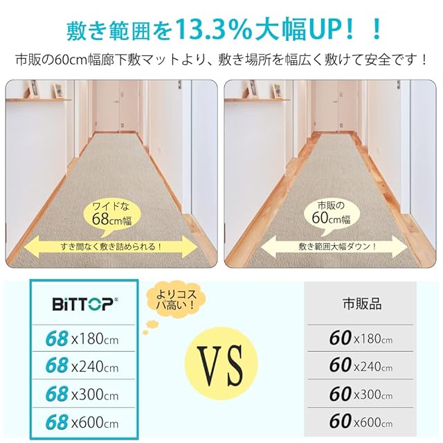 「都合によってカット可能」ハサミで自分の都合に合わせてカットできます。300×68cmのサイズなので、使いたい場所に合わせてサイズを自由にカットし、キッチンだけではなく、廊下、玄関、台所、階段、チェア、床のキズ防止用に役に立ちます。どごでも使え、マルチカーペットです。
