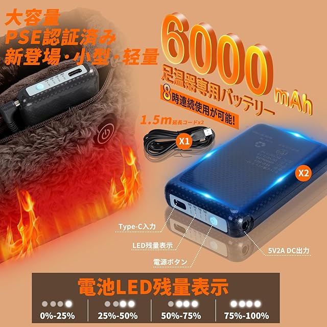 【2in1フットウォーマー&省エネ】当電気足温器は初代と二代のようにコードレスとコード付き二つの使い方を自由に切り替えることができます。コードレスの場合、自由に動けるので、調理や家事などをする時とても便利です。そして、1.5mの延長コードがついていて、バッテリーが電気切れの時やあんまり動けない時(デスクワークなど)などに使えばよいです。また、このフットウォーマーの消費電力は約20W (両足)で 1時間当たりの電気代は僅か0.54円ぐらい、とても省エネでお金の節約になります。