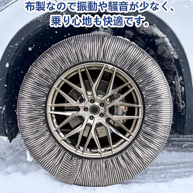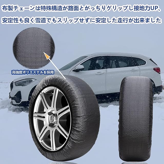 布製のタイヤチェーンです。装着はとても簡単です、技術なしでしっかりと取り付けることができます。金属チェーンは少しずれるとハマらなかったり、ゆるくなってしまったりと大変なのに比べてその点は非常に優秀でした。