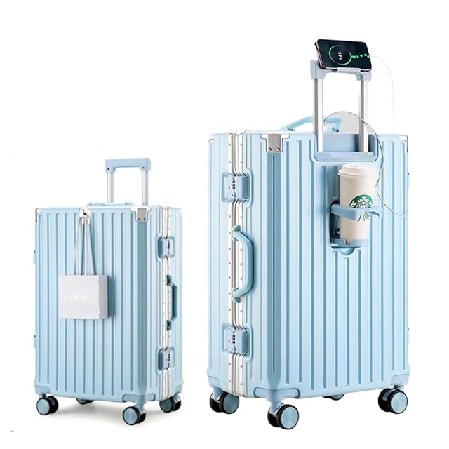 [Yuweijie] スーツケース アルミフレームタイプ キャリーケース 機内持込可 s/m/l/xlサイズ 3泊4日 多機能 バッグかけフック付き キャリーバッグ カップホルダー付き スマホホルダー付き 軽量大型 大容量 耐衝撃 人気 おしゃれ 静音 360度回転 ダブルキャスター 修学旅行 国内旅行 ビジネス 出張 ブルー 55l