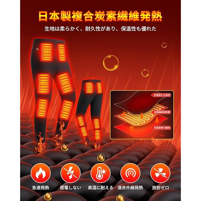 【12つヒーター内蔵&3秒速熱電熱パンツ】2025年冬新作発熱パンツは腹部2つ、膝4つ、後腰2つ、ふくらはぎ4つ、合計12つの発熱ヒーター内蔵します。優れた断熱効果を発揮し、体の最も冷えやすい部分を温めることができます。過熱防止機能を内蔵しており、暖かさと共に安全性を保ちます。付属のDC7.4V高出力バッテリーと接続して、わずか3秒で起動し、すぐに暖かさを感じされます。40000mAhの大容量ので、一日暖かく過ごします。釣り、オートバイ、ゴルフ、スキー、登山、屋外作業、通勤での防寒に非常に適しています。寒さを知らずに冬を過ごせます。ご注意:サイズですが、ゆったりしたいの場合はワンサイズアップを選んでください。