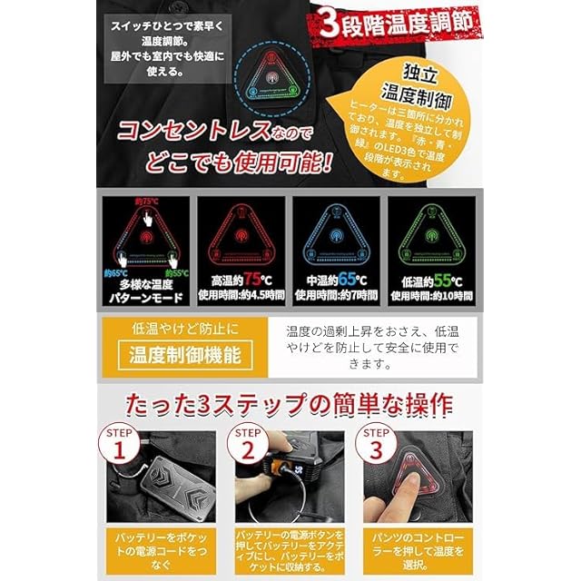 【大容量バッテリー付き&引き出し式電源ボタン&3エリア独立制御システム】30000mAh超大容量の専用バッテリーが付属しています。迅速に長時間安定して暖められる事が可能なDC給電に対応しています。電熱パンツの内側にはバッテリーを収納できる内ポケットがあり電源コードと接続するだけで簡単に使用することが出来ます。従来の貼り付け電源ボタン式ヒーターパンツに対し新たに引き出し式電源ボタンを採用。バイクパンツの腰&腹部、膝&もも、膝裏&ももの3エリアに分かれており、それぞれで温度調節可能です。3段階温度調節により、お使いになられるシーンに一番合う温度が組み合わせられます。ポタンをワンタッチで赤→青→緑の順番に切替ます。赤・青・緑ランプの色により温度段階が一目で分かります。電源ポタンの中心スイッチを長押しするだけで、全エリアを同時にON/OFFすることが出来ます。電源の操作が一気に楽々!