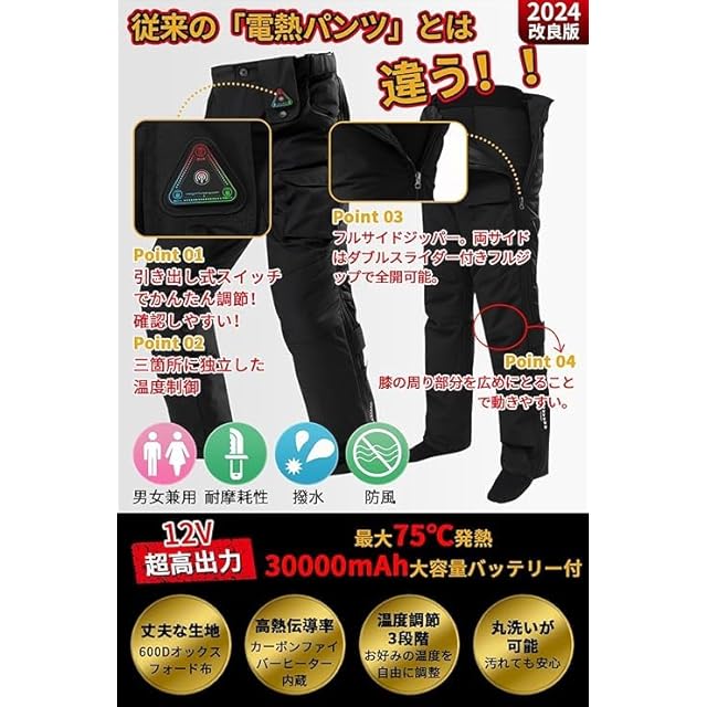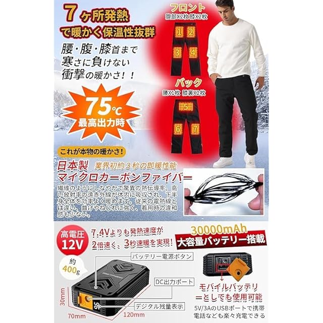【12V超高出力&3秒で速暖&驚きの暖かさ】「最大限の発熱」をする画期的な電熱パンツが新登場!ご愛用のお客様からいただいた声をもとに改良を加え、昨年より機能性や着心地をアップいたしました。改善ポイント1:バッテリーポケットを太もも側に移動し、パンツにかかるバッテリーの重さを軽減します。改善ポイント2:膝の空間を広くすることで動きやすくなり、柔軟性が大幅に向上しました。改良点3:バッテリー容量が大幅にアップ。バッテリー容量は昨年の2倍で、低温モードでの使用時間は最大10時間となっている。容量が増えても重量はあまり変わりません。冬に冷えがちな、腰、膝、お腹など寒さに弱い部位に対し、合計7つの広範囲電熱ヒーターを配置し、発熱面積が30%大きくなり、温めたい部位をしっかり温める!従来の7.4V出力に比べ12Vの超高出力で発熱速度がはるかに速いのが特徴です。また極細で強靭な日本製マイクロカーボンファイバーを採用しているため熱伝導率が高く、発熱温度は市販の同類製品より10~15℃も高く最大75℃に達することができ、一瞬で体全身ポカポカになります!