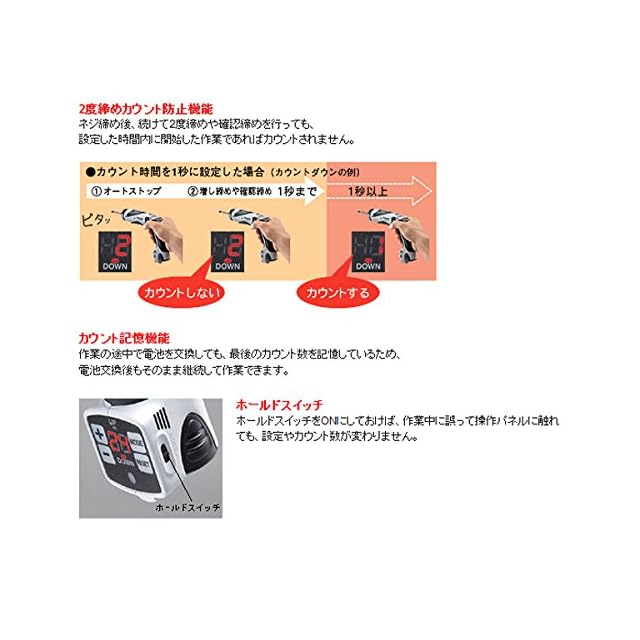 最大締付トルク:高速1.5N・m(15kgf・cm) 低速4.4N・m(45kgf・cm)