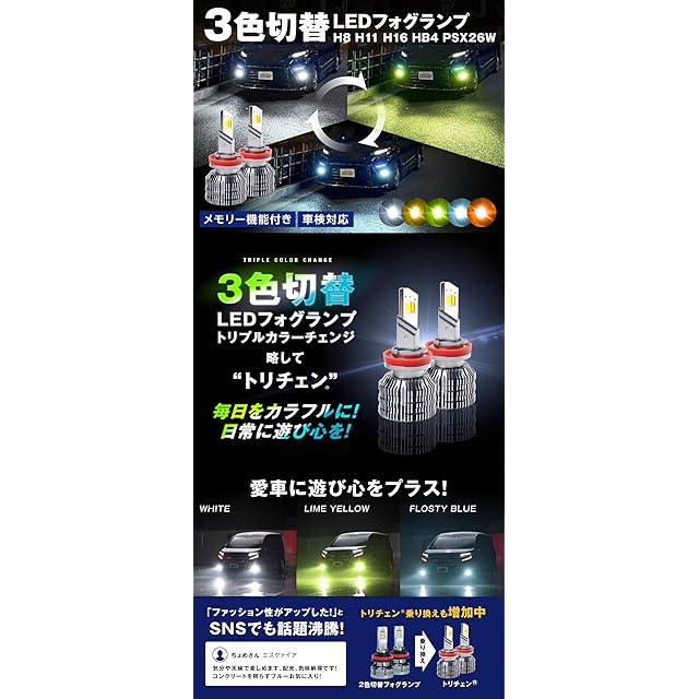 エフシーエルのカラーチェンジシリーズから新登場!待望の3色切替 トリプルカラーチェンジ LEDフォグランプ!既に2色切替を試したことがある方、フォグのカラー選択でお悩みの方、遊び心も忘れたくない方におすすめ。3色展開で様々なカラーにチャレンジしやすくなりました。王道カラーのホワイト(白色)、視認性の良いライムイエロー、チャレンジカラーとしてイエロー(黄色)とフロスティブルー(青)、そして新色アンバー(オレンジ)をご用意。他の3色LEDバルブとは違う、独自のチップ配置、発光の仕組みでこれまでにないフォグ体験をあなたに!バルブ形状には、h8 h11 h16 hb4 ハイエース用のpsx26wの左右セット。後付けタイプの商品のため、幅広い車種に対応した汎用品です。毎日をカラフルに!日常に遊び心を!fclのトリチェンで新時代をいくフォグランプを。