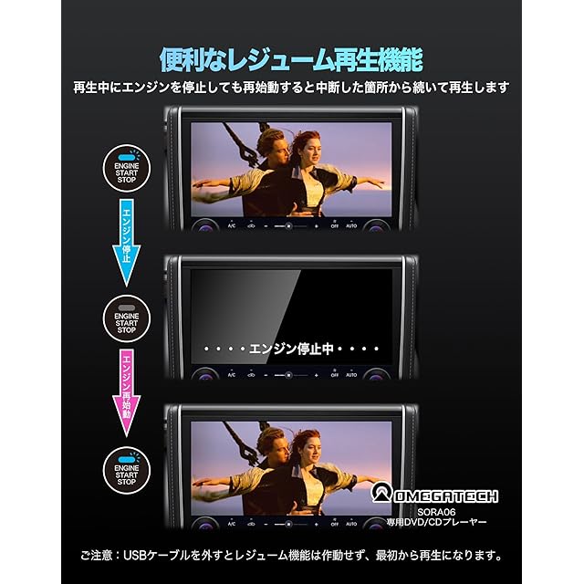 ●レジューム機能対応:改良版2025モデル新機能!再生中にエンジンを停止しても、再始動すると続きから再生いただけます。*USBケーブルを外すとレジューム機能は作動せず、最初からの再生になります。