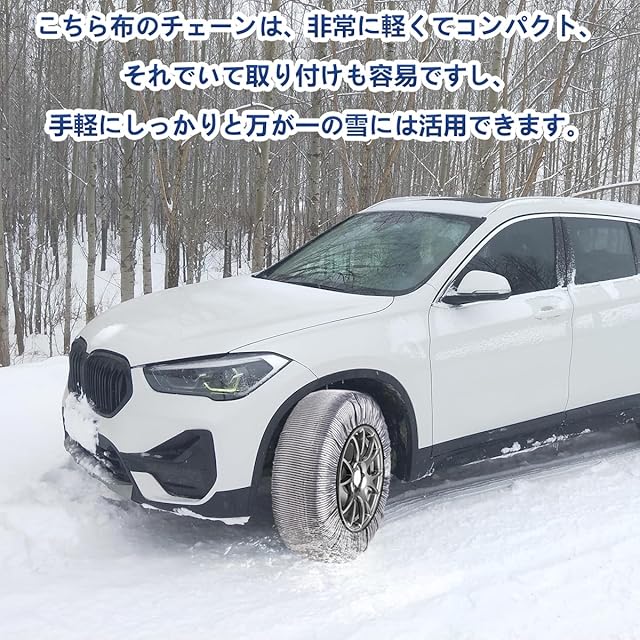 布製のタイヤチェーンです。装着はとても簡単です、技術なしでしっかりと取り付けることができます。金属チェーンは少しずれるとハマらなかったり、ゆるくなってしまったりと大変なのに比べてその点は非常に優秀でした。
