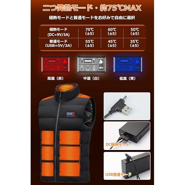 【9V業界最高出力バッテリー付き・二つ加熱モード&圧倒的な発熱温度】昨年大好評の電熱ベストをDC9V/3A極熱モードとUSB5V/3A普通モード両用タイプにアップグレード!発熱温度は最大75℃に達し、市販5V/2Aのヒーターベストより10~15℃アップ!また、発熱速度も同類製品よりはるかに速く、ワンタッチで一瞬にして身体全体ポカポカ!圧倒的な発熱温度により、気温が零下の日でも寒さ知らず。【※ご注意:モバイルバッテリーを電熱ベストに接続した後、まずモバイルバッテリーのON/OFFボタンを3~5秒で長押して起動させる必要があります。】