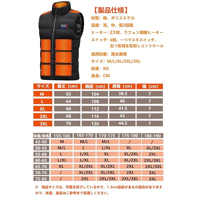 <b>【なぜこちらのバッテリー付きの2024年最新ヒーターベストを選ぶの?】</b><br> ☞<b>普通のヒーターベストより温度が高い</b><br> DC9V/3Aバッテリーや日本製グラフェン繊維ヒーターにより、発熱温度は最大75℃に達し、市販5V/2Aのヒーターベストより10~15℃アップ!<br> ☞<b>普通のヒーターベストより使用がもっと便利</b><br> メインスイッチ1つと各部位スイッチ5つ、共に6つスイッチボタンが装備されています。メインスイッチ1つでマルチコントロールでき、各部位を個別にコントロールする事もできます。<br> ☞<b>普通のヒーターベストよりDC/USB汎用</b><br> 昨年大好評の電熱ベストをDC9V/3A極熱モードとUSB5V/3A普通モード両用タイプにアップグレード!お好みで発熱温度を選択できます。<br> ☞<b>普通のヒーターベストより発熱面積が広い</b><br> 腹6枚、肩4枚、首元1枚、背中8枚、及び腰4枚、体全方位に共に23枚のヒーターを内蔵しており、発熱 面積が従来品よりほぼ倍増、業界NO.1の発熱面積を実現しました!<br> ☞<b>普通のヒーターベストより防寒機能がよい</b><br> 内側には精選された天然繊維綿を200g充填、裏地は保温性の良いアルミコーティング素材を採用し、通電しなくてもダウンとして十分暖かいです。<br> ☞<b>普通のヒーターベストより使用が安全安心</b><br> 過熱による火傷を防いで使用者を保護するために、過熱保護機能を装備、自動的に高温モードから中温モードへ変更します。また、耐久性もあり、放射線もゼロで使用者の安全も確保できます。<br> ☞<b>普通のヒーターベストより幅広く適用</b><br> 防寒ヒートベスト以外に、外には防水防風のポリエステル素材を採用して、しわ防止の表地で高級感があります。ニューファッションや防寒実用性を兼ね備えている電熱ベストです。<br> <b>【製品仕様】</b> <br>材質:綿、ポリエステル <br>ヒーター:23枚、ラフェン繊維ヒーター <br>温度:DC極熱モード:高、中、低3段階 USB普通モード:高、中、低3段階 <br>スイッチ:6つ、メインスイッチ1つ+各部位スイッチ5つ <br>バッテリーの仕様:40000mAh DC/USB汎用 <br>適用対象:男女兼用 <br>サイズ:M/L/XL/2XL/3XL <br>パッケージの内容:1*電熱 ベスト、1*40000mAhバッテリー、1*専用充電ケーブル、1*日本語取扱説明書<br> <br><b>【長い連続稼働時間】</b> <br>付属されている40000mAhの専用バッテリーをフル充電した後、最大12時間で連続稼働できます。 <br>加熱モードと温度モードにより、稼働時間が違います。 <br> DC極熱モード: <br>高温モード:4~5時間、中温モード:5~6時間、低温モード:8~9時間 <br> USB普通モード: <br>高温モード:6~7時間、中温モード:8~9時間、低温モード:10~12時間 <br><b>※上記は弊社が測定した値で、発熱温度や使用時間はご使用環境により変わります。</b>