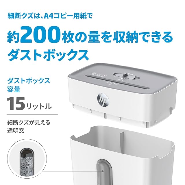 商品名:HP 電動 シュレッダー 家庭用 (15L / 1-3人用) 静音 コンパクト / 5x18㎜ミニクロスカット 8枚同時細断 (リモートワーク/在宅勤務/オフィス) 大容量ダストボックス (200枚収納)/ 小型 スリム