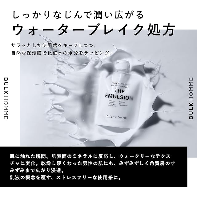 【洗顔】生石けんから生まれる濃密泡のクッションが洗顔時の摩擦刺激を防ぎ、保湿成分が肌の潤いを守りながら皮脂や毛穴の汚れまで吸着洗浄。スッキリした洗い心地とつっぱりにくい後肌感の両方を備えた洗顔料。THE BUBBLE NET(泡立てネット)をご使用頂くことでより濃密な泡洗顔が実現できます。 【化粧水】肌の角質層を潤沢な潤いで満たし、今の肌と未来の肌に同時にアプローチする、美容液仕立ての薬用化粧水。凝縮した保湿成分と肌に必要な水分・油分を”ナノバリア処方”で角質層まで素早く浸透してリッチに保湿し、ベタつきを残さずに深い潤いを実感できます。 【乳液】肌に触れた瞬間、ウォータリーなテクスチャーに変化する”ウォーターブレイク処方”で、ベタつきにくい自然な保湿膜を形成し、敏感になりがちな素肌を守る高保湿乳液。肌のベースを整える美容成分※が肌のバリア機能をサポートし、肌トラブルや年齢に負けない、柔軟でハリのある潤い溢れる肌に導きます。 【男性に特化した開発】肌荒れ、乾燥、テカリ、髭剃り負けなどの「今の悩み」と「将来の肌ためのメンテナンス」の両方にアプローチできるケアを目指して、年齢や肌質を問わず使い続けることのできる機能と効果実感を追求しました。 【製品について】肌を保湿して乾燥によるトラブルを防ぐ「8種類の天然由来の美容成分」や肌が本来持つ力を高める「トリプルサッカライド」を配合。10つのフリー「エタノールフリー、パラベンフリー、鉱物油フリー、合成着色料フリー、石油系界面活性剤フリー、紫外線吸収剤フリー、シリコンフリー、石油系油剤フリー、サルフェートフリー、マイクロプラスチックビーズフリー」