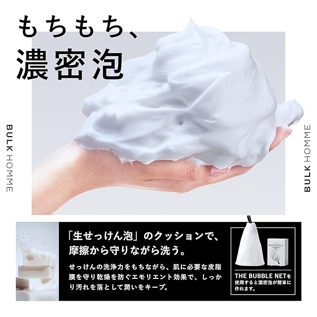 【洗顔】生石けんから生まれる濃密泡のクッションが洗顔時の摩擦刺激を防ぎ、保湿成分が肌の潤いを守りながら皮脂や毛穴の汚れまで吸着洗浄。スッキリした洗い心地とつっぱりにくい後肌感の両方を備えた洗顔料。THE BUBBLE NET(泡立てネット)をご使用頂くことでより濃密な泡洗顔が実現できます。