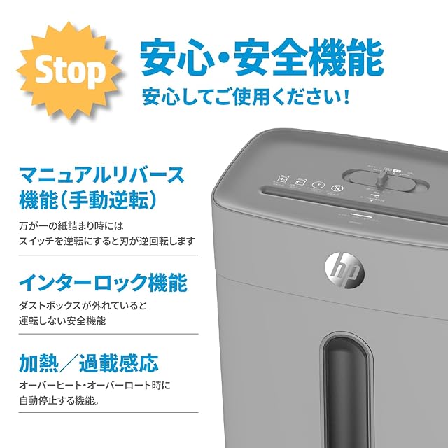 【使いやすさを追求したHPシュレッダー】:スタイリッシュなデザインはデスクサイドやリビングにぴったりフィット。大切な重要情報をいつでも手軽に細かく細断できます。一般的な家庭用ゴミ箱と同じくらいのコンパクトサイズで、家庭用電動シュレッダー として最適。分かりやすい操作で初めてでも簡単に使えます。 【自宅でも機密漏洩を防止】:A4コピー用6枚を一度に投入できて、クレジットカードも楽々細断。機密書類を5×18mmに細断可能で、ご家族の大切な個人情報や会社の重要情報を守ります。家庭用や在宅勤務におすすめのパーソナルユース・家庭用シュレッダーです。 【大容量のダストボックス】:約15リットルの大容量ダストボックスは、A4コピー用紙で約160枚を収納でき、廃棄回数を減らせます。 【商品性能】:最大細断枚数:A4コピー用紙 6枚(64g/㎡) クレジットカード 1枚 / 細断寸法:5×18mm (クロスカット) / 定格連続運転時間:4分間 / 細断速度:約1.6m/分(50/60Hz) 【商品詳細】外形寸法:約320×190×416mm / 本体質量:約4.3kg / コードの長さ:約1.5m / 投入幅:220mm(A4対応) / ダストボックス容量:約15L (A4コピー用紙で約160枚収納) / 期間:安心の18ヶ月長期 (取扱説明書に記載の使用方法を遵守した場合)