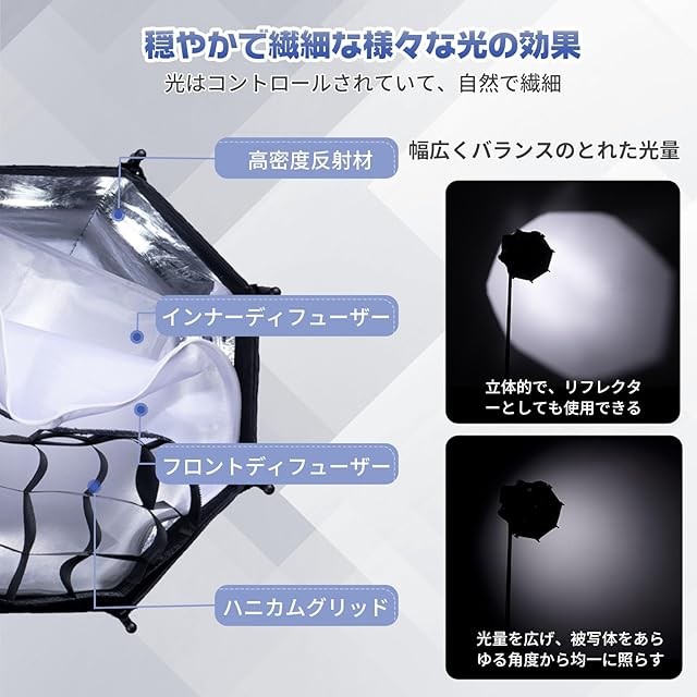 【操作簡単】ソフトボックスは一体構造で、わずか数秒で瞬時に開閉できます。従来のバージョンよりも便利で効率的です。8 本の弾力性のあるリブは、何万回のプレスや長年の使用にも歪みなく耐えることができ、簡単に折りたたむことができ、付属のキャリングバッグに収まるので保管も簡単です。