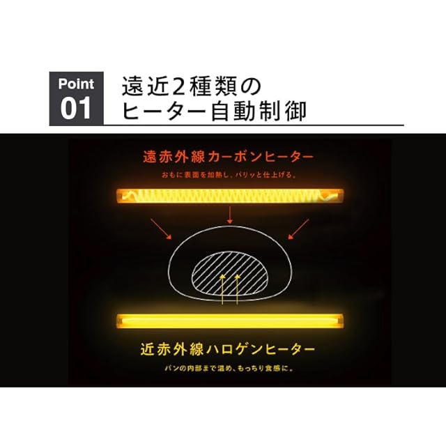 【自動制御で叶える、 魔法の温度バランス】焦げ目をつけずに表面をパリッと仕上げる遠赤外線と、内部までしっかりあたためもっちり食感を引き出す近赤外線、性質の異なる2つのヒーターがそれぞれに独立アプローチ。匠が認めた「魔法の温度バランス」に仕上げます。