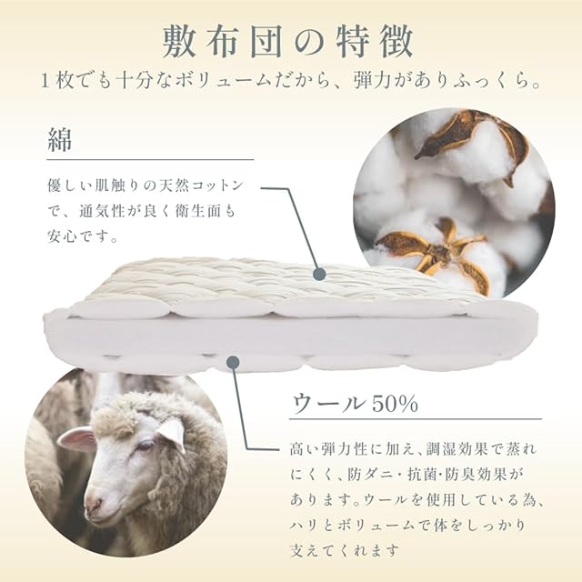 『アプロディーテ』汗臭さや細菌・ダニも防ぐ!安心の日本製 ●なか(中綿)の清潔 … 『アプロディーテ』の中綿には、防ダニ・抗菌防臭効果のあるテイジン「マイティートップ2ECO」と吸・放湿性の高い天然素材である羊毛を使用しています。 ・高い忌避効果でダニを寄せ付けない。ダニの繁殖を防ぐ。 ・羊毛の持つ吸・放湿性・保温性の特徴が、夏はサラッと快適に、冬はしっかり暖かく、一年通して快適にお使い頂けます。 ・抗菌防臭効果で細菌や嫌なにおいを防ぐ。 ●そと(生地)の清潔 … 『アプロディーテ』の生地は綿100%で和歌山県で染色・SEK(抗菌防臭)加工しているので安心かつ清潔! ・天然素材の綿100%200本ブロードの生地を使用しております。綿は吸湿性に優れ、また、やさしい肌触りが特徴です。お肌に敏感な方に、特におすすめです。 ・SEKとは「清潔」「衛生」「快適」のことで、繊維評価技術協議会が定める基準をクリアしたものだけがマークの付与を認められます。『アプロディーテ』に使われる生地もこのSEKマークの付与が認められたものです。 ・SEK(抗菌防臭)加工で細菌や嫌なにおいを防ぐので清潔をキープできます。 ●なか(中綿)の清潔 + そと(生地)の清潔 Wで清潔!!普段お手入れで清潔キープ! ●寝心地抜群なワケ ・ウレタン素材は熱がこもり夏場は寝苦しく、冬は硬くなりがちですが、こちらの敷布団はそのようなことはありません。 ・高い通気性で寝苦しさを感じることはありません。 ・Cloud+製法で理想的な寝姿勢を実現します。さらに、体圧分散効果や耐久性もUP ・厚み10cmではちきれそうなほどの超ボリューム。 ・マットレス不要! 寝返りに必要な固さとコシがあるので、朝起きた時の快眠感が違いますよ!疲れもしっかりとれます。