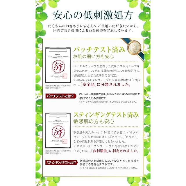 【パッチテスト済み】ダメージの蓄積した頭皮に浸透させるローションだからこそ、無添加・フリー処方にこだわりました。パッチテスト・スティンギングテスト(塗布したときの皮膚への刺激を評価する感応性テスト)をクリアした敏感肌の方にもお勧めできる仕様となっております。