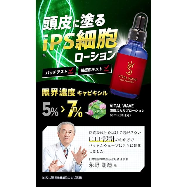 商品名:【 頭に塗る i PS細胞 】【 頭皮の専門家 永野剛造 監修 】 VITALWAVE 高濃度キャピキシル7% 濃密スカルプローション ヘアトニック 男性用 女性 兼用 スカルプケア (育毛剤 ではない) 60ml (単品)