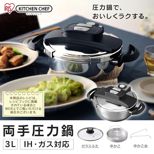 【光熱費節約・時短】アイリスオーヤマ 圧力鍋 3.0L IH対応 内側目盛り付 【レシピ本・ガラス蓋付き】 3層底 スライド開閉 圧力2段切替 安全ロック機能 両手鍋 RAN-3L シルバー