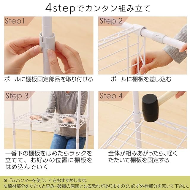 ポールに入った約2.5cm間隔の溝で棚の高さを変えられる