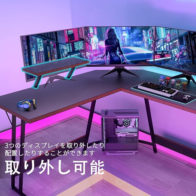 <b>VICTONEゲーミングデスク</b>ゲーミングデスク 、ゲームデスク 、大型オフィスワークデスク、パソコンデスク、すこく便利で頑丈、ブラック<br>高品質のオフィス家具、快適なホームライフとライフスタイルを提供することを目指している家具ブランドです。<br>L字ゲームデスクは、取り外し可能なモニター台を備え、スペースを最大限に活用しています。<br>家に置いても、オフィスに置いても、職場に置いても、生活環境をおしゃれにすることができます。<br><b>メリット</b><br><b>「より広いスペース」</b><br>l字型デスクは、より広いスペースを節約し、天板にゲーム設備だけでなく、色んなものを置くこともできます。<br>机の下には広いスペースがあるので、足が縛られる感じがしなく、より快適な作業環境を提供します。<br><b>「高品質パーツ採用」</b><br>厚さ1.5センチの表面板はすべて炭素繊維でできており,それに頑丈な合金フレームを加えることで安定性を高めている。<br>調節可能な脚のデザインは、必要に応じて不平らな床でも安定性を確保します。<br><b>「取り外し可能なモニター台」</b><br>取り外し可能なモニター台が机のどの側にも簡単に固定でき、好きのように机のスペースを利用します。<br><b>「ファッションなデザイン」</b><br>黒と赤の組み合わせはよりエレガントにされ、部屋にファッションな外観を提供します。<br>また、質感の表面は美しさだけでなく、防水や滑り止めにもなっています。<br> <b>使え範囲が広い</b><br> これは理想的なパソコンデスク、ゲームデスク、オフィスデスクで、<br>ホームワークステーション、書斎、リビング、寝室、レクリエーションルーム、音楽室、メディアルームなどに適します。<br> <b>仕様</b> <br>形状:l字パソコンデスク、取り外し可能なモニター台付き<br> 製品サイズ:130センチ (奥) * 130 センチ (幅) * 74センチ (高さ);<br> 荷重:100キロ<br> スタイル:モダン&コンテンポラリー;<br> 素材:炭素繊維木製天板+頑丈な金属フレーム;<br> 塗装:木材塗装;<br> 色:ブラック<br> パッケージ内容:1パソコン机、1セットの付属品と工具、1組み立てマニュアル。<br> <b>注意</b>:すべてのネジが対応する穴に入るまで、ネジを締めないでください。<br> 指示に従って順番に操作してください。誤ったネジを使用すると机の天板が破裂することがあります。