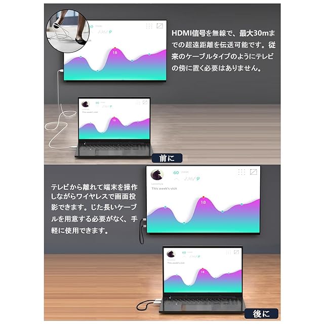 【1080p HD 高解像度】ワイヤレスHDMIトランスミッターとレシーバーは、最大1920×1080 @ 60以上の解像度のビデオ解像度をサポートし、自動エンコード、送信、デコードによりビデオ品質を維持し、圧縮やアーティファクトなしでフルRGB色域をサポートします。非互換4 K。