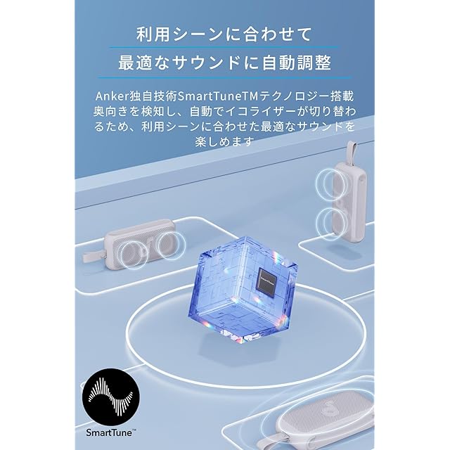 最適なサウンドに自動調整:Anker独自技術SmartTuneテクノロジー搭載。置く向きを感知し、自動でイコライザーが切り替わるため、利用シーンに合わせた最適なサウンドを楽しめます。