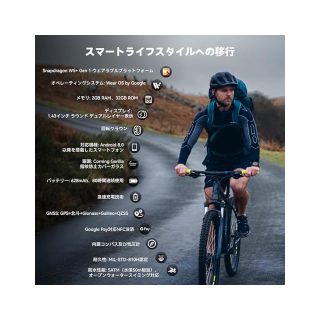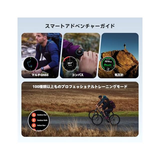 【進化した運動管理システム】100種類以上のワークアウトモード、GPS、コンパス、バロメーターを搭載し、リアルタイムで運動データを記録できます。キャンプや登山、釣り、ダイビングなど様々なアウトドアシーンに活躍します。5ATM防水仕様でオープンウォータースイミングも対応できます。