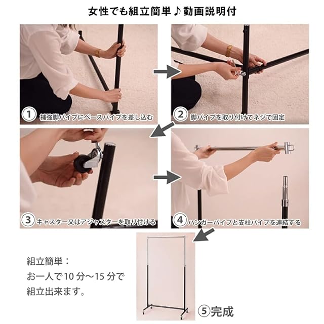 【簡単組立】必要な工具は全部セットになっています。パーツをはめ込むだけのシンプルな構造のため、初心者や女性が一人で組み立てても10~15分程度で完成します。エンドキャップには 合成樹脂製 の保護カバーが付いており、床を傷つけにくくなっています。※組立解説動画もご用意しております。