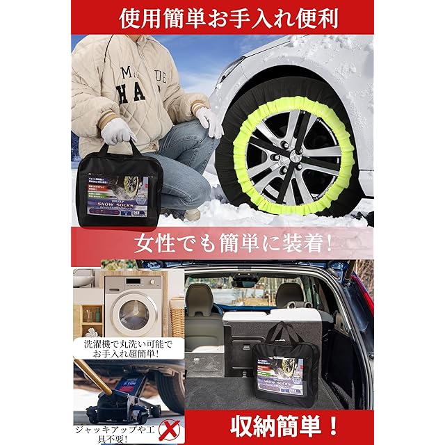 パッケージ内容:製品には包装用手提げバッグ、2枚のTIPGOUP布製タイヤチェーン 、作業用の手袋と取り扱い説明書が同梱されています。 アピール色:製品内側の生地はアピール黄緑色の丈夫な布で、耐用で雪の日の視認性を高めます! 改良版ストラップ:スノ一ソックスのストラップは、ストラップ本体に十文字に張られた黒色のバンドが、製品の取り付けと取り外しに使うだけにとどまらず、フィット感?安定性を高める働きをしています。 【様々なシーンに大活躍】サマ一タイヤ&スノ一タイヤ両対応:サマ一タイヤ(ノ一マルタイや)とスノ一タイヤ(スタッドレス) どちらにも装着してお使いいただけるのでコスパ抜群です。 幅広いサイズ展開:TIPGOUP自動車用布製タイヤチェーンには13インチ~22インチまで6種のタイヤ種類があり、SUV車、スポーツかー、軽自動車、ワイド、低偏平タイヤに対応する商品ラインアップし、市販のほぼ全てのタイヤサイズをカバーします!500を超えるタイヤサイズ(507種サイズ)に適合しています。 取り付け簡単 ①スノーソックスを広げます。 ②黒色のベルトを表側に向けた状態でゴム部分を両手で広げ、ゴム部分がタイヤ裏側のサイドウォールへかかるように上部から被せ、徐々に下方へ被せてください。 ③タイヤを半回転分移動させます。 ④残りの部分は引き上げながらタイヤに被せ、反対側の駆動輪にも①、②、③の手順で本商品を被せてください。取り付け完了です。