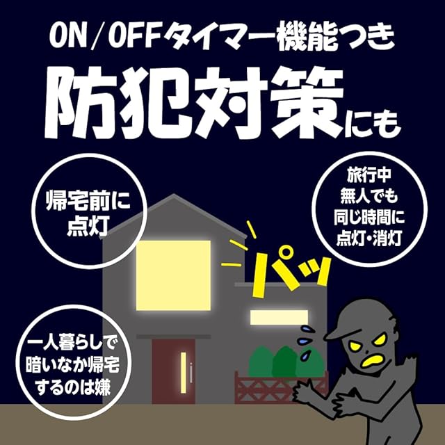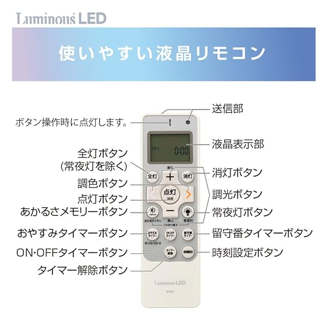 おやすみタイマー30/60分。当社市場最大光量で広い部屋も辛く照らす。