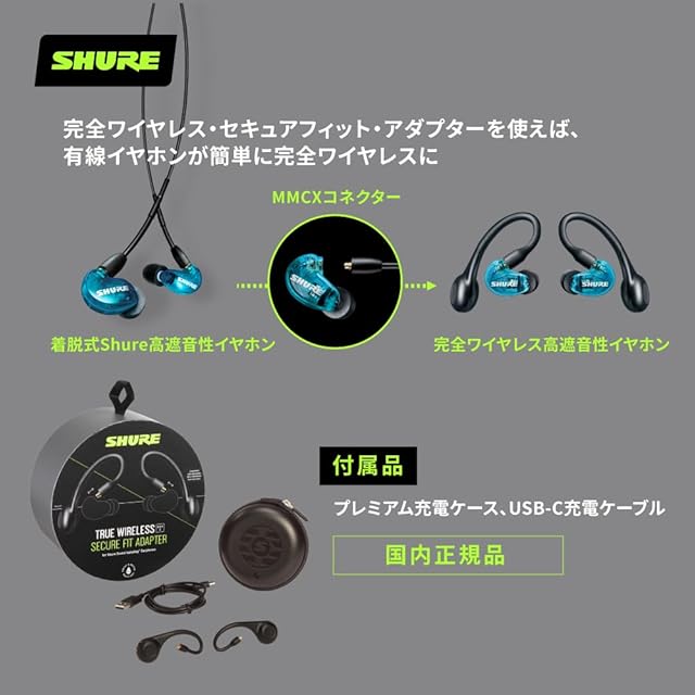 商品名:SHURE シュア RMCE-TW2 ブラック ワイヤレス・セキュアフィット・アダプター : ワイヤレスイヤホン変換 MMCX 耳掛け IPX4防滴 外音取り込み マイク付 Bluetooth 5.0 音楽 オーディオリスニング ランニング トレーニング ウォーキング Type-C ケーブル 付属 【国内正規品/メーカー2年】
