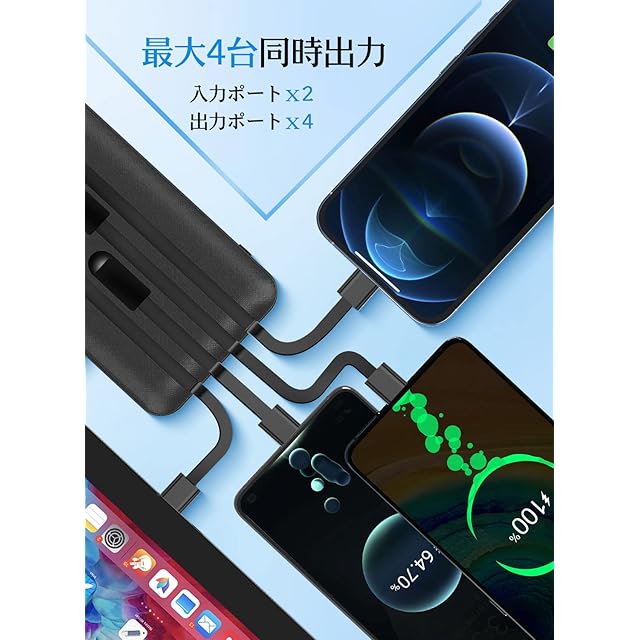 商品名:モバイルバッテリー 大容量 【20000mAh & 4ケーブル内蔵】 急速充電 Type-Cケーブル内蔵 携帯充電器 最大2.1A出力 旅行/出張/停電対策/緊急/防災グッズ PSE認証済 安全設計·回路保護 持ち運び便利 機内持ち込み可能 iPhone/iPad/Android各種対応