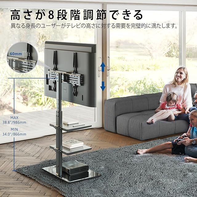 【ラック回転・高さ調節】高さが金具と支柱の取り付け位置により、8段階の高さ(1060mm~1240mm)を選択して取り付けることができます。異なる身長のユーザーがテレビの高さに対する要求を完璧的に満たし、便利で快適な視覚的な楽しみを実現します。また、左右方向へ±35°回転することができるので、最適な調整角度で調整し、いろんな視角からの観賞を満たします。リビングルームだけでなく、キッチンや寝室に居ても、回転角度によって、素晴らしい瞬間を見逃しません。