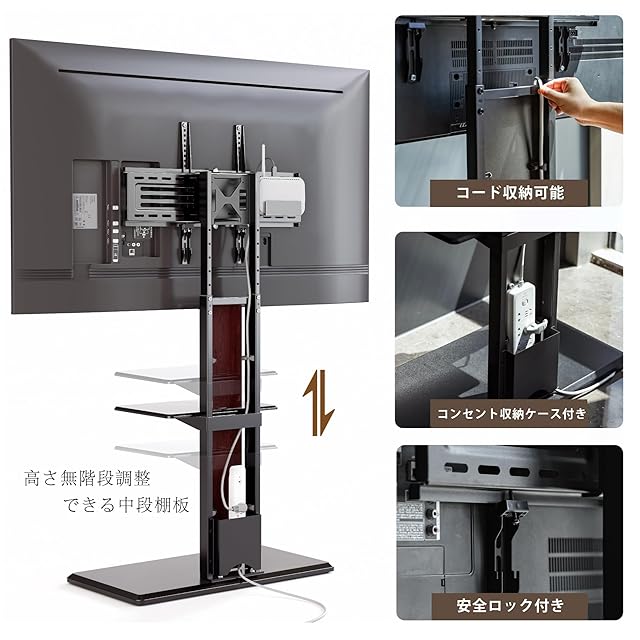 【商品仕様】本体サイズ:幅750mm×奥行395mm×高さ1180~1440mm、底板サイズ:750×395mm、梱包重量:約18.6kg、耐荷重:ラック/40kg、対応VESA規格:100mm x100mm~600mm x400mm、対応テレビサイズ:32~65インチ、角度調整:左右に20°首振り可