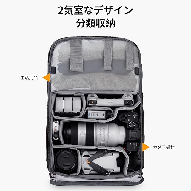 【1つバッグあればOK】外サイズ:30cm ×18cm×44cm「最大容量:20L」、内サイズ:28cm ×16cm ×42cm。*ご注意:手動測定には誤差があります、ご了承ください。* K&F Conceptのベータ大容量 カメラバッグは、カメラ本体1機 、レンズ4本、ドローン1台、16インチのパソコンケースを収納可能です。携帯電話や財布、モバイルバッテリーなどのデジタルアクセサリー用のスペースがあります。カメラリュックのサイドポケットには、水筒や傘などの身の回り品を入れることができます。本製品は、普段使いできるや、カメラと他の荷物が分けられる2気室仕様、三脚も固定可能なおしゃれな大容量リュックです。