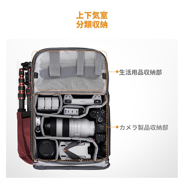 【1つバッグあればOK】外サイズ:30cm ×18cm×44cm「最大容量:20L」、内サイズ:28cm ×16cm ×42cm。*ご注意:手動測定には誤差があります、ご了承ください。* K&F Conceptのベータ大容量 カメラバッグは、カメラ本体1機 、レンズ4本、ドローン1台、16インチのパソコンケースを収納可能です。携帯電話や財布、モバイルバッテリーなどのデジタルアクセサリー用のスペースがあります。カメラリュックのサイドポケットには、水筒や傘などの身の回り品を入れることができます。本製品は、普段使いできるや、カメラと他の荷物が分けられる2気室仕様、三脚も固定可能なおしゃれな大容量リュックです。