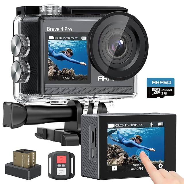 【高画質4Kアクションカメラ&タッチパネル式】AKASO Brave 4 Proアクションカメラは高精細な映像を撮影できるプロの4K/30fpsを搭載しており、拡大しても粗さが目立ちにくく、静止画もきれいに切り出せます。高画質の録画をお手軽に楽しめます。高性能ソニーセンサーを搭載しておりますので、20MPの高品質な写真を記録できます。また、2.0インチタッチパネル式液晶画面を採用して、直感的に素早い設定変更ができ、物理ボタン式より使いやすいです。デュアルカラースクリーンを搭載しており、撮った映像をいつでもすぐに確認できます。insやYouTubeに向けた素晴らしい動画を簡単に制作することができます。256GB SDカード付属、別に購入する必要がありません。