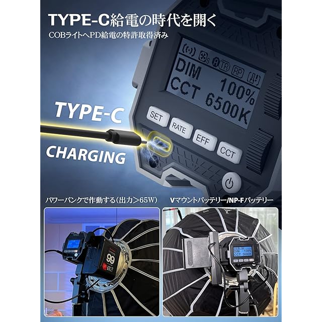 【最先端のUSB-C端子&多種バッテリー給電】照明業界の最先端COLBOR CL60は、付属のUSB-Cポートに接続することで給電が可能です。 市販のVマウントバッテリーやNP-Fバッテリーを使用し、アクセサリーを組み合わせて電源供給が可能です。使用中途切れの心配は不要です。