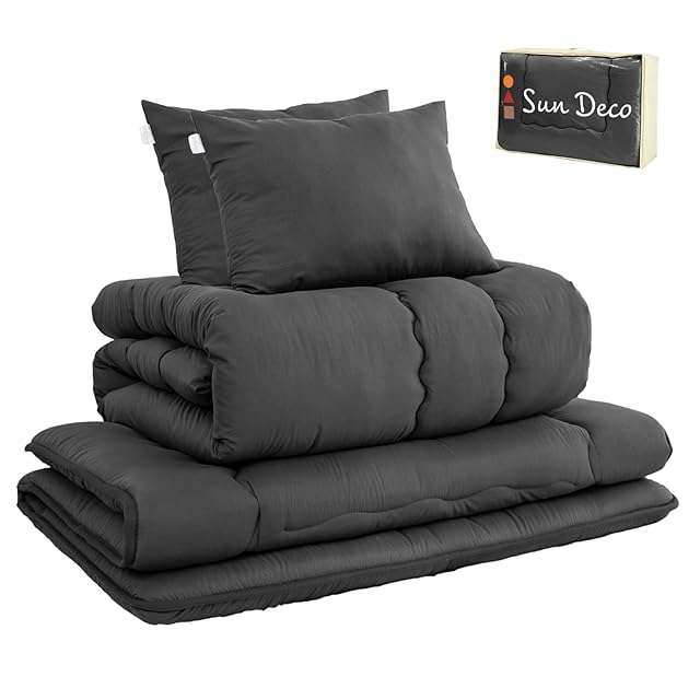 Sun Deco 布団セット ダブル 布団 5点セット 寝具セット 来客用布団【SEK認証】【マイティトップ中綿使用·敷き布団】防菌防臭 洗える ふとんセット 布団せっと 中綿約1.8kg 掛け布団 ダブル 敷布団 枕*2 収納ケース付き ピーチスキン加工 オールシーズン 防カビ 無地 ブラック