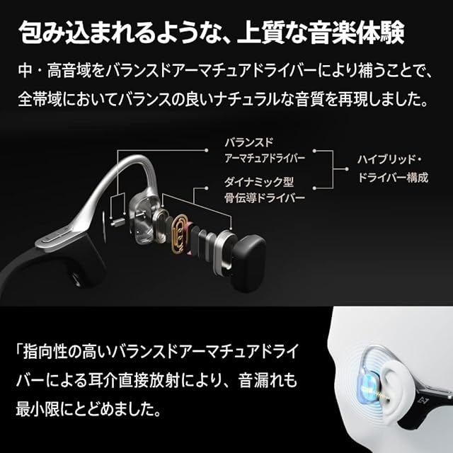 "ながら聴き"も一段上の体験へ:骨伝導ドライバーとバランスドアーマチュアドライバーの組み合わせで、全帯域のバランスの良い音質を実現。